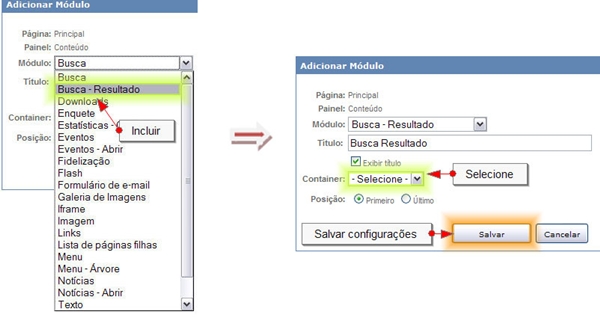 Para listar o resultado da busca é necessário incluir o módulo “Resultado -Busca” na página que foi configurada anteriormente como “Página de resultados”’. Seguir os mesmos passos para a inclusão do módulo de busca, mas escolher o item “Busca - Resultado”.