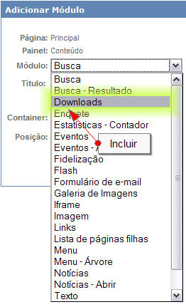 Para inserir esse módulo clique na opção “Outro módulo” no menu de opções do painel desejado. Na próxima tela escolha o item “Download” nas opções listadas.